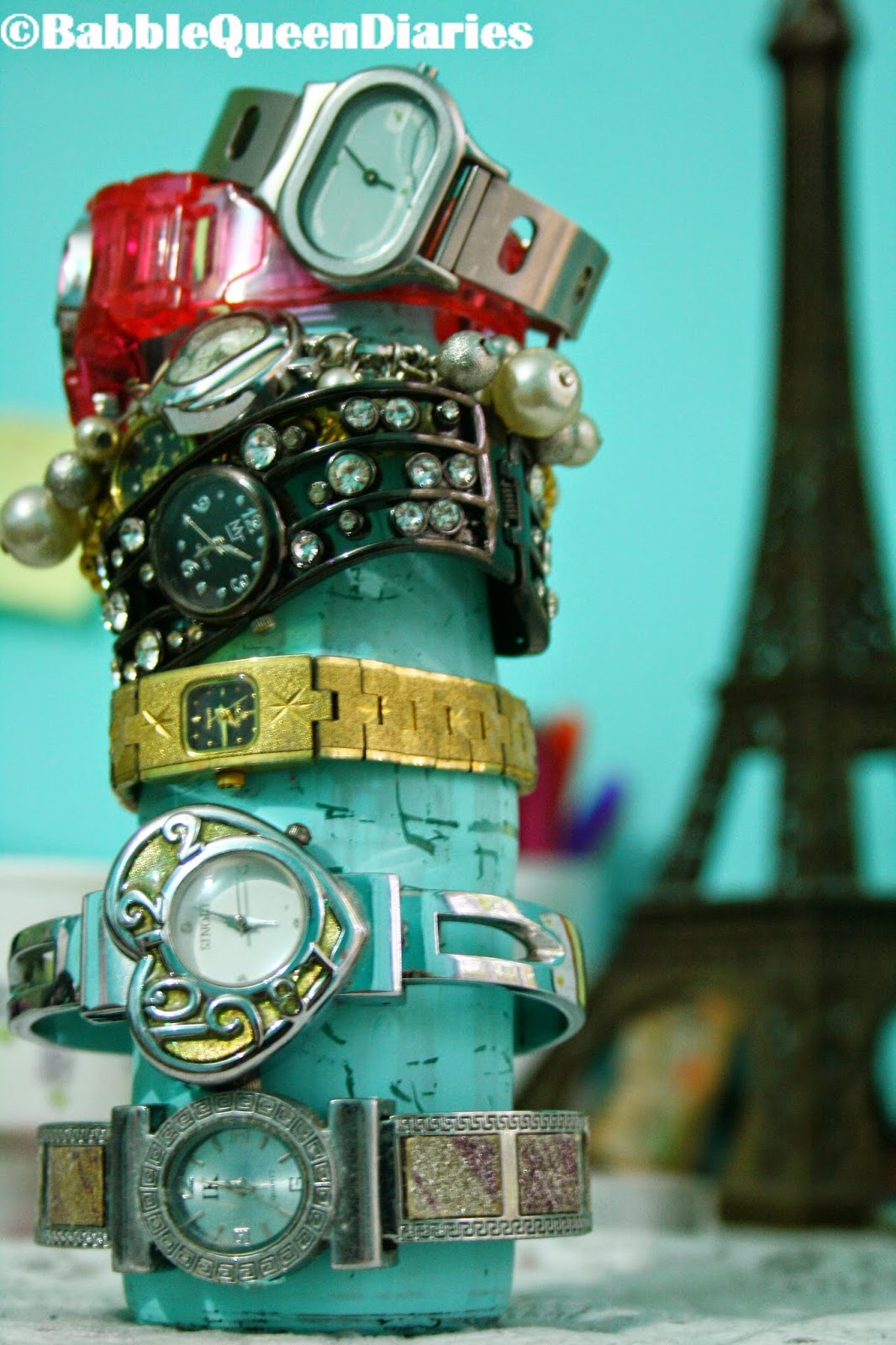 To store my watches, I covered an old glass bottle with some paint left over from painting the room and covered it. Once it was dry, I simply put my watched on the bottle, once after the other.